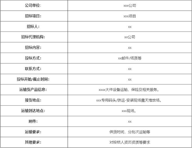 廣告和邀請函的內(nèi)容大體相同,主要包括:運(yùn)輸方的單位名稱、地址;發(fā)運(yùn)物件名稱;招標(biāo)的有關(guān)信息(招標(biāo)文件號或名稱,所運(yùn)物件的參數(shù)說明,運(yùn)輸?shù)奶厥庖?,運(yùn)輸?shù)钠鹗嫉睾湍康牡?,運(yùn)輸時間);招標(biāo)文件的價格、以及開始出售招標(biāo)文件的時間;報送投標(biāo)書時間、地點(diǎn),及投標(biāo)截止期限;投標(biāo)保證金金額;對投標(biāo)人的資格要求。
